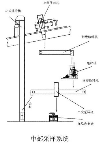 圖片展示了一種典型的中部?jī)杉?jí)采制樣系統(tǒng)。該系統(tǒng)由旋斗式中部采樣機(jī)、初級(jí)樣品給料機(jī)、錘式破碎機(jī)、次級(jí)樣品給料機(jī)、二次采樣機(jī)和余料處理設(shè)備等組成。