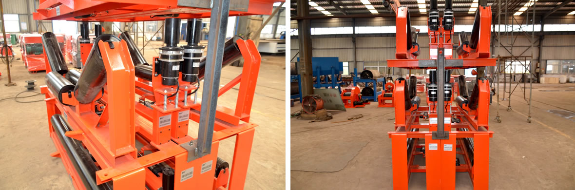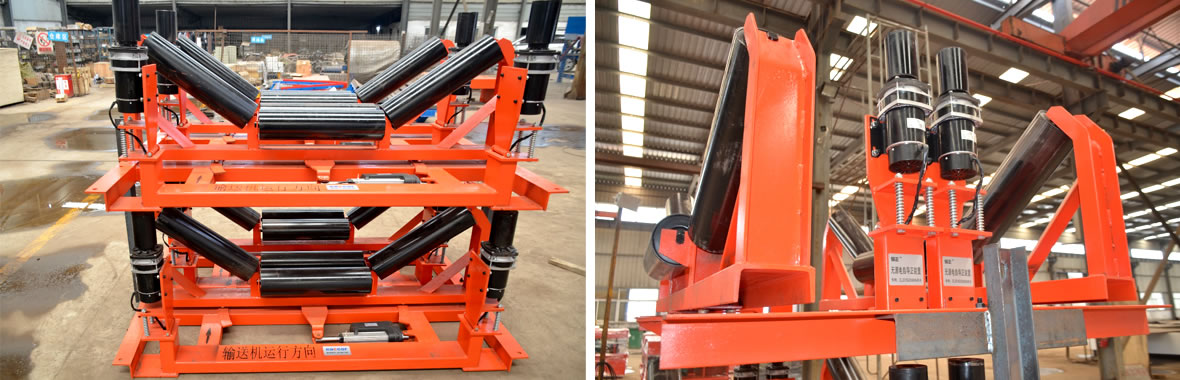 根據(jù)皮帶機(jī)的現(xiàn)場(chǎng)條件及使用特點(diǎn),皮帶機(jī)由于溫度過(guò)低張力不穩(wěn)、托輥竄動(dòng)、托輥粘料、托輥卡死,物料偏載,沖水等原因,經(jīng)常出現(xiàn)皮帶跑偏現(xiàn)象。選擇在輸煤皮帶機(jī)頭部、尾部承載段安裝2套,每套智能自動(dòng)導(dǎo)正裝置可以保障50m輸送機(jī)良好運(yùn)行;導(dǎo)正性的平衡調(diào)整皮帶的運(yùn)行中出現(xiàn)跑偏的現(xiàn)象,并避開(kāi)皮帶秤稱重域安裝,加強(qiáng)皮帶機(jī)穩(wěn)定運(yùn)行對(duì)計(jì)量的保障作用。